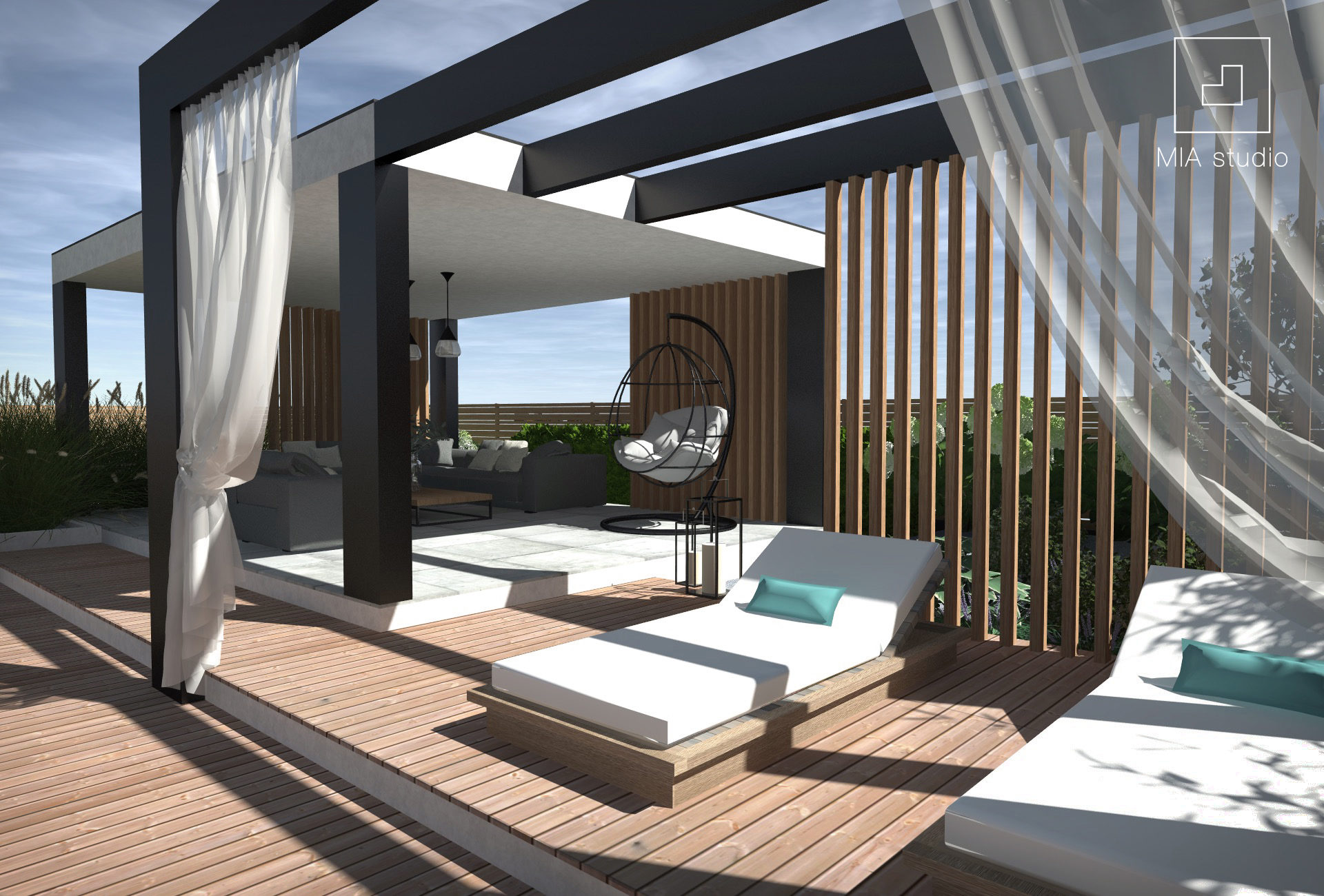 Strefa wypoczynkowa to wyniesione miejsce pod pełnym zadaszeniem, które zajmuje około 30 metrów kwadratowych. Zaaranżowano w niej przestrzeń dla 8 osób z sofą oraz bujakiem. Nawierzchnię w tej części altany proponuje się wykonać z wielkoformatowych, jasnoszarych płyt betonowych. Strefa relaksu zajmuje 20 metrów kwadratowych i obejmuje platformę z leżakami dla 2 osób pod ażurowym zadaszeniem. Ze względu na bliskość basenu w projekcie wykorzystano płyty gresowe, imitujące drewno, które są antypoślizgowe i odporne na działanie środków chemicznych.
